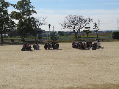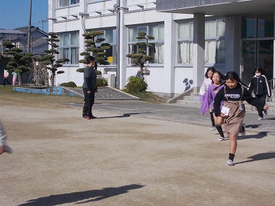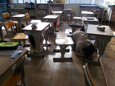 「訓練、訓練、地震発生、地震発生」という緊急放送が入り、教室にいた児童たちは、近く机の下に入り、シェイクアウト。運動場で遊んでいた児童たちは、運動場の真ん中に集まって、シェイクアウト。