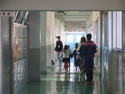 「火災発生。運動場に避難してください」のアナウンスに、教室にいた児童たちは、運動場に避難しました。
