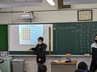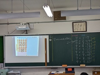 2年松組では、算数「7のだんを作ろう!」を学習していました。7に7をたしていけば、7のだんは完成しますが、今までに習った九九を使って、7のだんの答えの見つけ方を考えた子もいました。いろいろな考え方を見つけて、発表しました。みんなの前で説明することにも、慣れてきました。