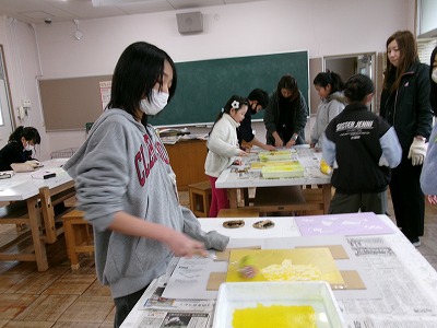エアコンがない図工室での授業です。ガスストーブを付けて授業を行っています。今日のように非常に冷たい日は、手もかじかんで、なかなか彫刻刀を使っての作業も進みません。刷って、版を乾かして、彫ってと、彫ること、刷ることを交互にすすめていきます。今日は、寒いうえに天気もよくないので、版が乾きません。一度、刷った人は、なかなか次の工程に進めません。版が乾くまで、他の子のお手伝いをして待っています。子どもたちは、作品作りに打ち込んでいました。