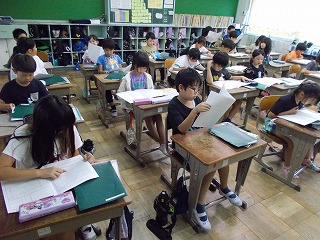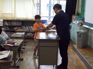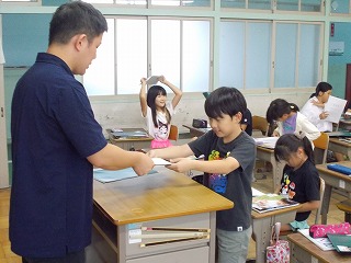 今日で前期が終業します。各教室で、担任の先生から子どもたち一人一人に通知表が渡されました。その際、担任の先生からは、子どもたちに「前期の成績をみて、頑張ったことや足りなかったことなどを振り返り、後期の取組につなげよう」という話がありました。子どもたちは渡された通知表を食い入るように見つめていました。