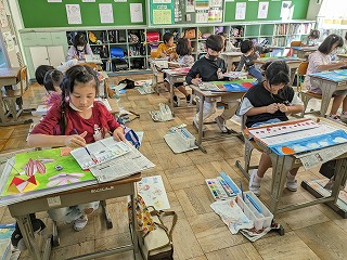 工夫しながら絵に表します。今日は、絵の具で色塗りをしました。完成は間近です。