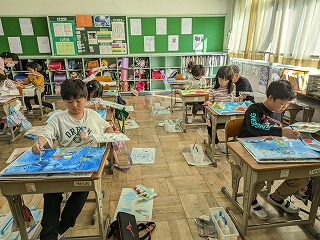 3年松組の図工の授業の様子です。「ひらいて広がる ふしぎなせかい」という題材で、想像した世界を、開く仕組みや、形や色、表し方を