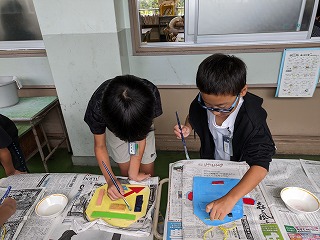 4年松組では、図工の「ギコギコトントンクリエーター」で、作品の仕上げで、ニス塗をしました。「くさーい」と言いながらも、自分の作品がきれいになっていくのを喜んでいました。