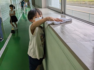 今年の1年生はたった10人です。掃除ももちろん10人で担当箇所全部やらなくてはいけません。手洗い場の掃除の二人は、時間ギリギリまできれいにしています。廊下掃除の子は、廊下の桟をきれいにしています。15分間ですが、1年生ながら毎日きれいに掃除をしています。いつもきれいにしてくれてありがとう!!