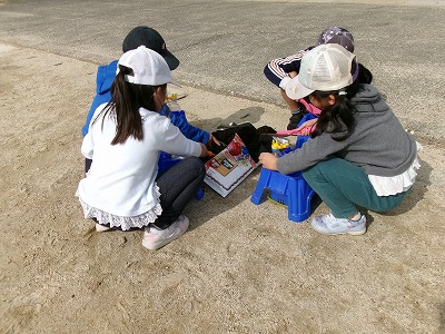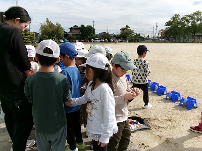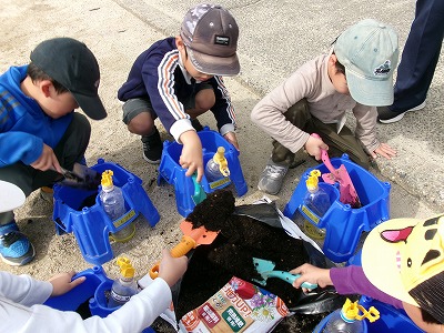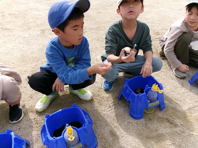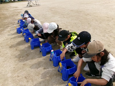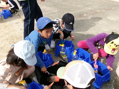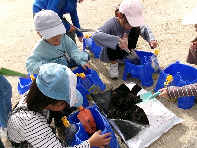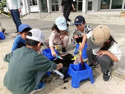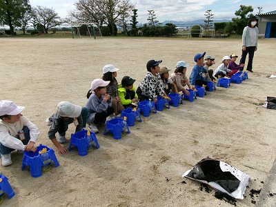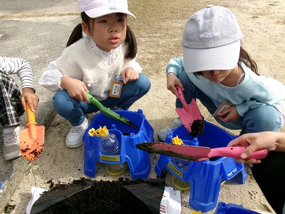 1年生は生活科の時間にチューリップの球根を植えました。アサガオで使っていた鉢に土を入れて、チューリップの球根を一人、3つずつ植えました。きれいな花が咲くといいですね。どんな色のチューリップかな??