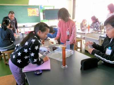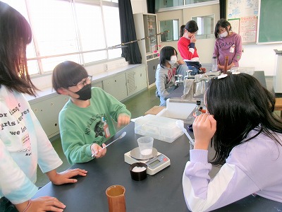 5年生の理科の実験の様子です。5年生の理科では、「物のとけ方」の学習をしています。今日は、「水にとけて見えなくなったものは、どうなったのだろうか」ということで、食塩を水に溶かしたときのことを思い浮かべて、予想をしました。食塩を水に溶かす前と溶かした後の重さを比べてみることにしました。