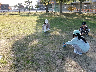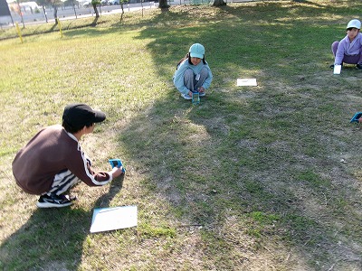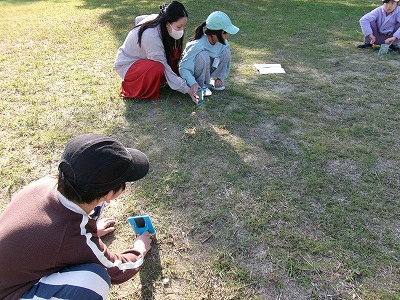 グループに分かれて、かがみではね返した日光を、ほかのかがみではね返してつないで、日光の進み方を調べました。日光の進む道を見つけるのがむずかしかったようです。それでも、3人、4人とつなげることができたグループもありました。