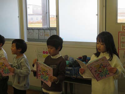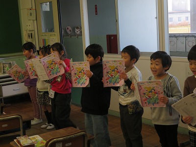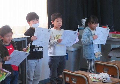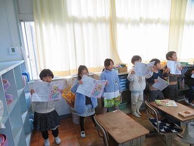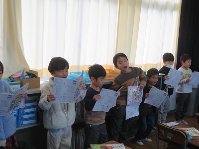 1年生の教室から、歌のまねっこあそびをしているような楽しい歌声が聞こえてきます。「もりのくまさん」を一緒に歌ったり、交互に歌ったり、いろいろな歌い方を楽しみました。最後に、教室のはしに移動して向き合って、お互いの歌声を聞きながら交互唱に挑戦です。とても上手にかけ合い、笑顔がこぼれます。