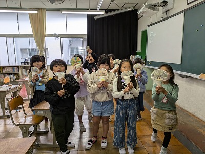 せつめいのしかたに 気をつけて読み、それをいかして書こう」という学習をしています。その中で、紙コップ花火の作り方が出てきます。そこで、説明文を読んで、実際に紙コップ花火を作ってみたそうです。できた作品をみんなで見せ合っているところでした。「ほら、見て、もうすぐクリスマスだから…こんな絵を描いたよ」「花火のところ、こんなふうに色をつけたよ」などと、それぞれが作った紙コップ花火を見せ合っています。