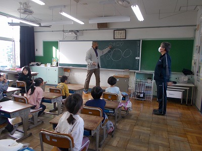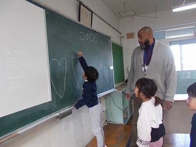 2時間目は、ジェイファーズ先生による英語活動でした。今日は、形や数の言い方を練習しました。ジェイファーズ先生が言われた形を黒板にかいていきます。大きなハートをかく子もいれば、色のチョークを使ってかく子も…。みんな、大喜びです!