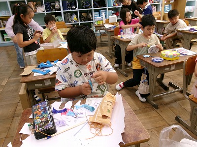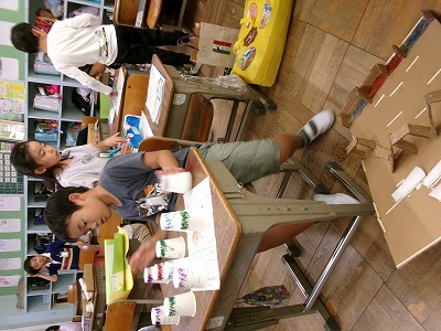 2年生の生活科の様子です。単元「せかいでひとつ わたしのおもちゃ」で、動くおもちゃ作りをしています。