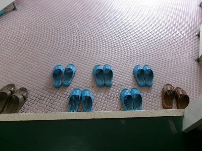 南館2階の女子トイレです。スリッパの向きがそろっています。次の人がスリッパを履くときのことを考えて、少し前にずらしてあります。ちょっとした気遣いですね。