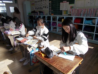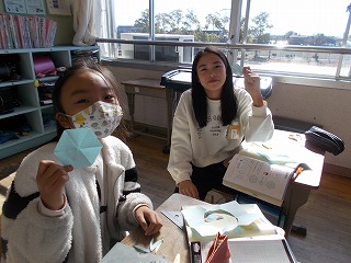5年松組の授業の様子です。紙に円を描いてそれを三角定規の角の大きさを使って折って切ったら…どんな形ができるかなという授業でした。「円と正多角形」の学習に入ります。