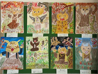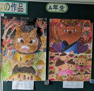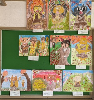 4年生の掲示板です。図工で「どんぐりと山猫」の感想画を描きました。このお話の時代背景や当時の衣装などを自分で調べて描きました。どの作品も力作ばかりです。