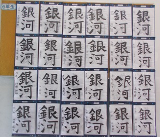 6年生の掲示板です。書写の時間に書いた習字「銀河」が展示してあります。