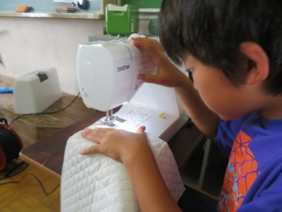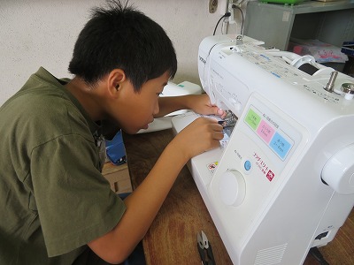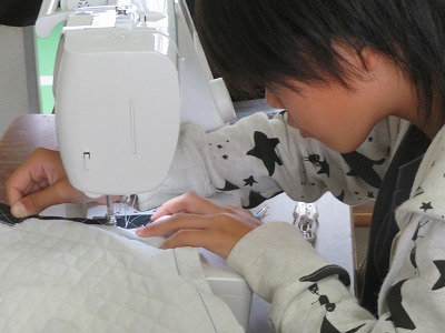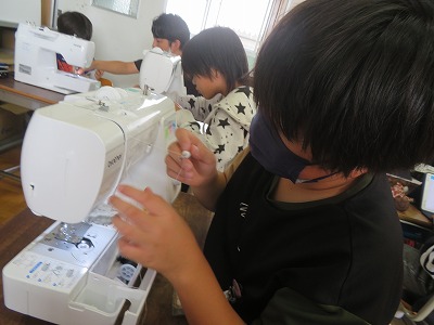 順調に上糸をかけ、最後のミシン針の小さな穴に糸を通すところに苦戦しましたが、「まず返し縫いだっけ?」「そうそう!」とお互いに確かめ合いながら、どの児童も集中して分厚い布も縫うことができました。きっと、丈夫なナップザックができあがりますね!