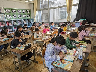 2年松組の音楽の授業の様子です。「だがっき パーティーをしよう」という題材でした。まずは、7つの打楽器の音を聞いてその特徴を捉えます。そして、CDから流れてくる打楽器がどの順番で出てくるかを聞き当てます。みんな、耳を澄まして真剣に聞いています。さあ、どの楽器が一番に聞こえたかな?