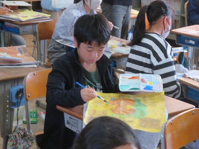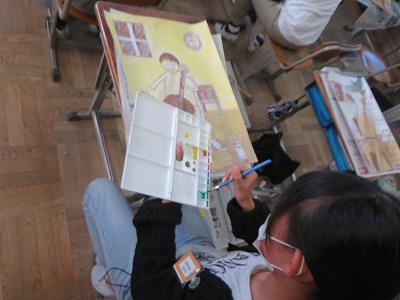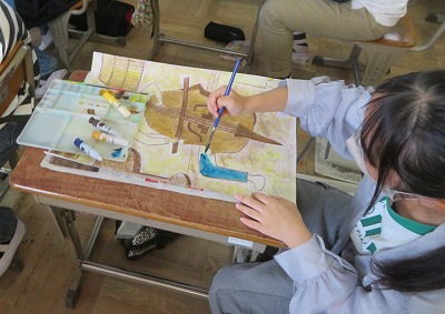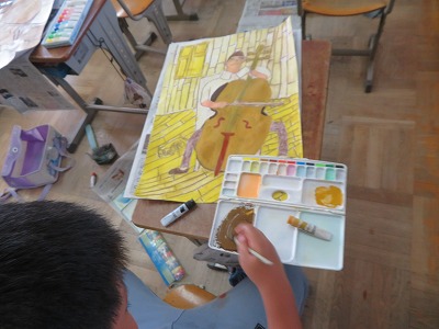 6年生の教室中の机に、やわらかな色合いの作品が並んでいます。茶色のコンテを使っていることもあるのでしょうか、なんとも温かみのある、やさしいタッチでチェロを弾くゴーシュが描かれています。今日は絵の具で彩色をしていましたが、よく見てみると、誰一人としていわゆる「べた塗り」をする子がなく、筆をトントンと置くようにうすく、あわく色をつけていきます。それぞれに部屋の様子や物語に出てきた動物を描き、すてきな作品に仕上がりました!