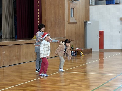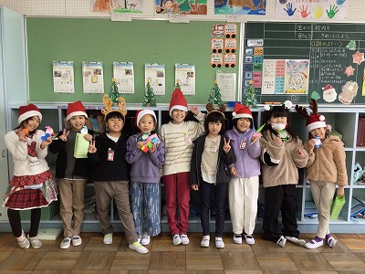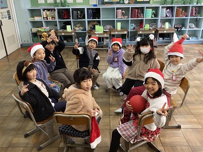 クリスマスにちなんで、トナカイのカチューシャ、サンタさんの帽子などをかぶって、クリスマスムードを盛り上げています。ゲームをしたり、増えおにをしたり、プレゼント交換をしたりしました。