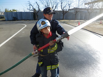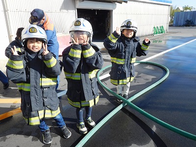 防火服を着て放水体験もさせていただきました。ずっしり重い防火服を着ての放水には、かなりの力がいることを実感したようです。見学を終えて、消防署の方に多くの質問をしていました。