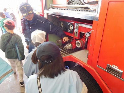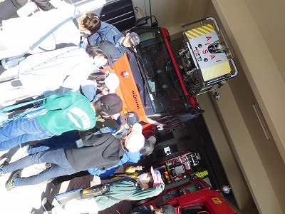 まずは、「車両見学」をしました。救急車、はしご車、ポンプ車、救助工作車などを見せていただきました。いろいろな機能の設備や大きなものもあり、みんなびっくり!!最近、導入されたばかりの救助工作車もみせていただきました。