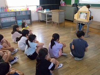 9月13日(金) 夏休みが終わって最初の読み聞かせがありました。今回は3、4年生です。9月17日(火)が中秋の名月であることにちなんで、両学年ともに月に関係のあるお話を読んでいただけました。読み聞かせで季節を感じさせてもらえるのは、すてきですね。