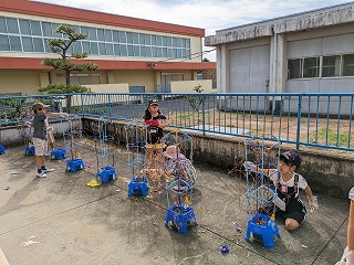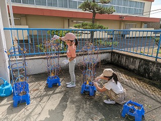 1年松組では、4月から育ててきたアサガオの花が終わったので、つるを使ってリースづくりをすることになりました。まずは、枯れたアサガオのつるをはさみで切って、支柱から取り外します。つるがくねくね曲がっているので、支柱から外すのも一苦労です。さて、どんなリースになるのか、楽しみです。