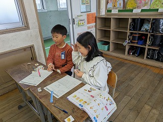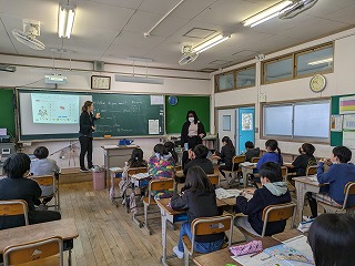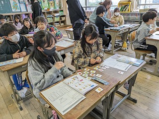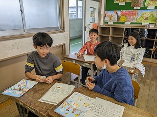 4年松組の外国語活動の様子です。今日は、「オリジナルパフェをつくろう」ということで、ペアでお店の人役とお客役になって、