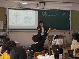 5年生は、毎日の給食に米、パン、麺が必ず出るのは?の問いかけから、お米ができるまでにたくさんの手間がかかることについてお話がありました。