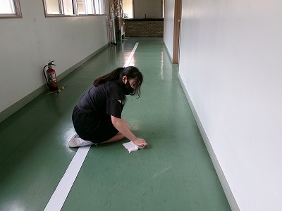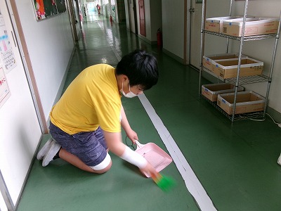 6年生の掃除の様子です。校長室前の廊下を膝をついて丁寧に汚れをとってくれています。ミニほうきを使ってすみずみまできれいにしています。