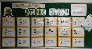 保健室前の掲示板です。寒くなると体が縮こまってしまいます。そこで、体ほぐしのストレッチをしようということで、全部で18種類のストレッチが紹介されています。ぜひ、皆さんもやってみて、体ほぐしをしましょう。ストレッチをすることで、ケガの防止にもつながります。