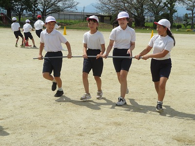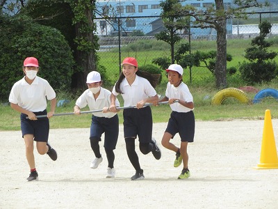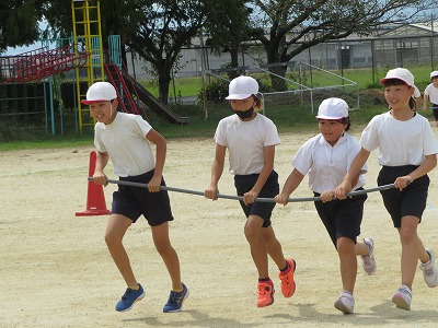 高学年は「台風の目」にチャレンジです。4人で棒を持って、コーンを回って、ゴールをめざします。