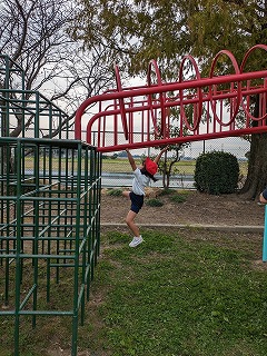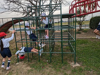 1年松組の体育の授業です。「遊具遊び」をしました。写真は、立南小にある「ジャングルサーカス」という遊具で遊んでいるところです。