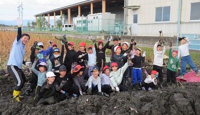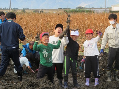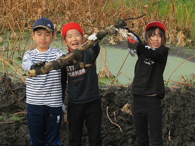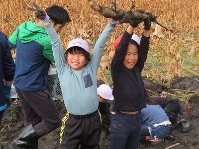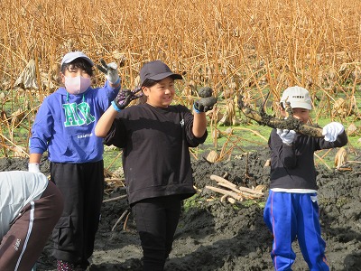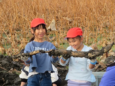 JAの方々、立田広域委員会の方々など、多くの方に手ほどきを受け、3年生が愛西市の名産「れんこん」掘りを体験しました。れんこんが地中で育っていることは知ってはいても、初めて自分の目で見て、知って、収穫することができ、みんな時間いっぱいワクワクしながら体験させていただくことができました!「見てみて~!」「とれた~!」「やった~!」とても長くて立派なれんこんも多く、1本をとるのにスコップや手で時間をかけて掘ったので、とれた喜びも格別です。心に残るれんこん掘り体験となりました。お力添えをいただいた皆様、ありがとうございました!