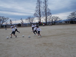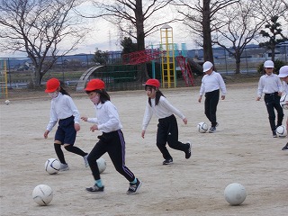 2年松組の体育の授業の様子です。サッカーをやっています。カーブを曲がるときは、インサイドキック、直線を蹴っていくときは、インステップキックを使うことを学びました。実際にトラック1周をボールを蹴りながら、やってみました。さあ、うまくできたかな?