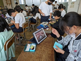 縫い方を忘れてしまった人は、タブレット端末で動画を見ながら作業しています。(今どきですねぇ)また、早くできた子が、困っている子のお助けをする場面も…。