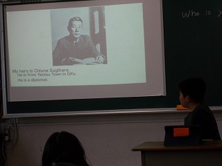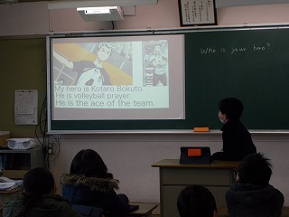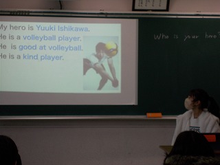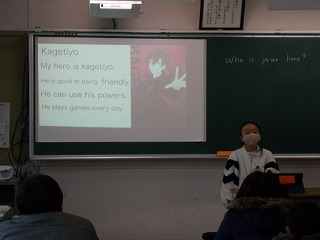 5年松組の英語の授業の様子です。今日は前回までに作成した「My hero」のスライドを使って発表がありました。英語で自分のヒーローを紹介するだけではなく、スライドには、英文にして表します。取り上げられたヒーローは、さまざまです。ユーチューバー、アニメのキャラクター、スポーツ選手、歌手、偉人、友達…。残念ながら、筆者は半分以上、分かりませんでしたが…