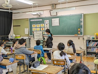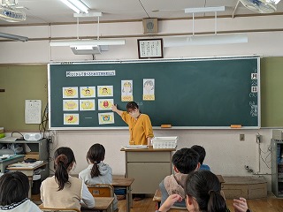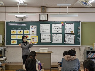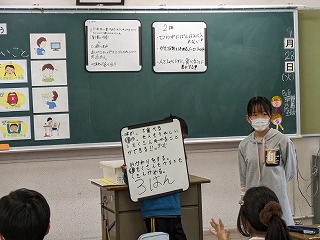 今日のめあては、「よくかんで食べるための工夫を考えよう」です。食べるときによく噛むことで、8つのよいことを歯科衛生士の方から教えていただきました。「ひみこのは いーぜ」の8つです。その後、グループになって「よく噛んで食べるための工夫」を考えました。グループごとに考えたアイデアを発表し、担任の先生や歯科衛生士の方から、すばらしいアイデアに対して、『グットアイデア賞』をいただきました。よく噛んで食べることの大切さを学習しました。