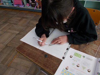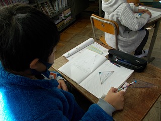 3年松組の算数の授業の様子です。三角定規の角の大きさを比べます。さて、どのように比べたらよいかを考えました。三角定規を2つに折ることはできないし…、分度器を使う…などの意見が出ました。今日は、三角定規の角を写し取って、比べることをしました。写し取ることや、比べることに戸惑っている子には、できた子が『ミニ先生』となって、教えています。