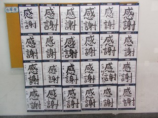 6年生の掲示板です。今は、「感謝」という習字が掲示してあります。これまでに学習したことに気を付けて書きました。