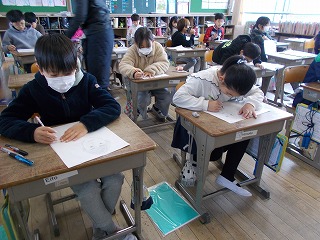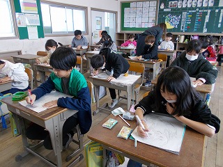 4年松組の図工の授業の様子です。版画の下絵を木板に写しているところです。カーボン紙を使って、板に写します。どの線を写したらよいのか、向きを反対にした方がよいのかを考えながら慎重に写しています。