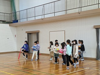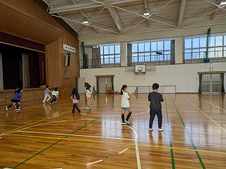 体育館に集まって、ルールの説明を聞きました。2つのチームに分かれて、対戦しました。少しの時間でしたが、楽しく遊ぶことができました。来週の月曜日には、4~6年が対象で行われます。