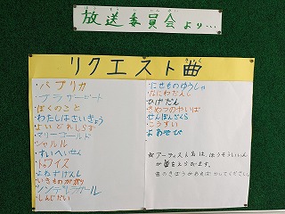 前期もあと少しです。各委員会で前期のまとめをしています。放送委員会では、各学年からリクエストを取り、お昼の給食放送でリクエストされた曲を流しています。