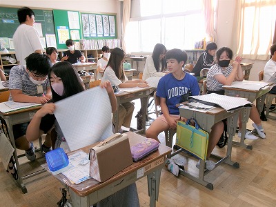 6年生の家庭科の様子です。単元「思いを形にして 生活を豊かに」で目的に合ったふくろを製作しています。今回は、ナップザックかトートバッグのどちらかを選んで作ることにしました。今日は、縫うところやひもを付けるところなどの印を付けました。