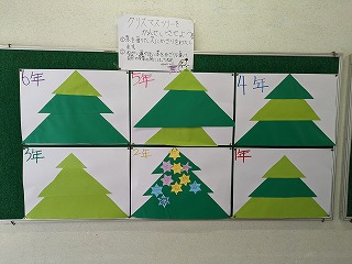 後期図書委員会で、新たな取組が始まりました。タイトルにある「クリスマスツリーを完成させましょう!」です。内容は、図書室で本を借りると、飾りがもらえます。その飾りに願い事や欲しい本を書いて、学年のツリーのところに貼っていきます。どの学年もきれいなツリーが完成するといいですね。