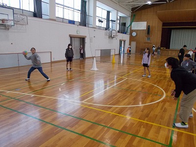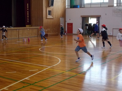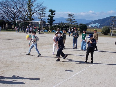 体育館に集まった班は、鬼ごっこやドッジボールを、運動場に集まった班は、しっぽ取りや鬼ごっこ、ドッジボールをしました。