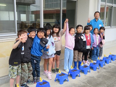 夏野菜のミニトマトを苗から育てた前回からレベルアップして、今回はタネから「サニーレタス」づくりに挑戦する2年生。JAの村上さんに来ていただき、栽培の仕方やコツを教わりました。