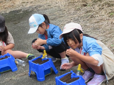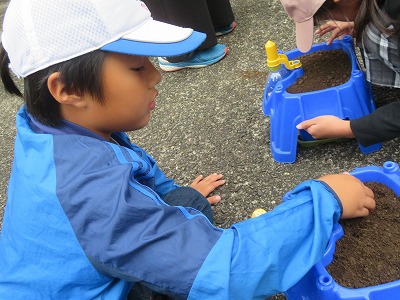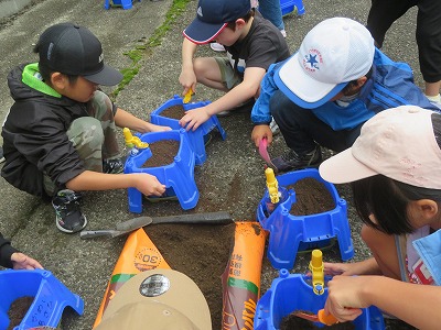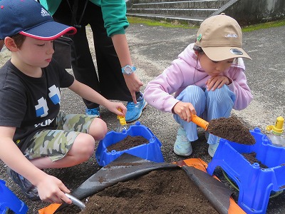 「土はふんわりだよ!」なんて声をかけあう姿は、前回の学びが生きているのを感じます。サニーレタスのタネはあまり深くまかなくてもよいこと、4日くらいで芽が出ること、虫に食べられないよう注意がいること、水は土がかわいたらやればよいこと、肥料もやらなくてよいこと、間引きしなくても大丈夫なことなど、ミニトマトのときとの違いを感じながらのタネまきとなりました。さあ、おいしく育てていきましょう!
