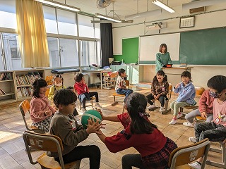 1年松組では、「爆弾ゲーム」といって、音楽が鳴っている間に爆弾に見立てたボールを次の人に渡していきます。音楽が止まったところでボールを持っていた人が負けです。負けた人は、抜けていきます。
